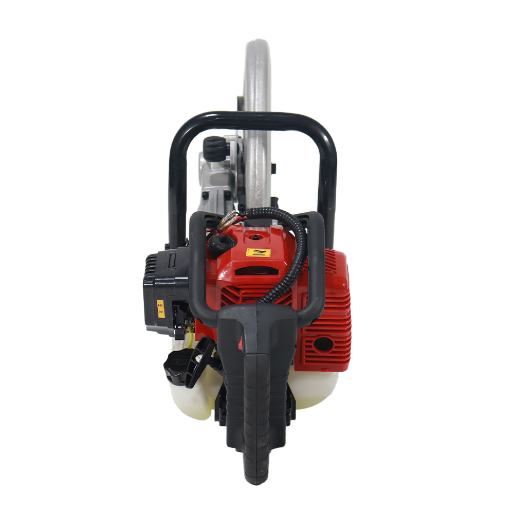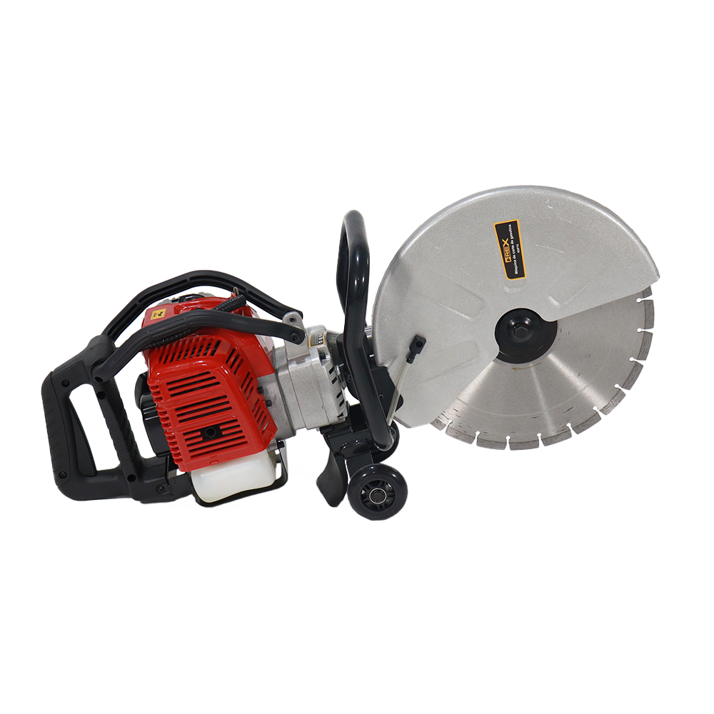 Cortadora portátil con motor a gasolina de 52CC, 2 tiempos, tanque de 1L y disco de 14″ (350 mm). Ideal para cortes de concreto, block, asfalto y metal en obra.