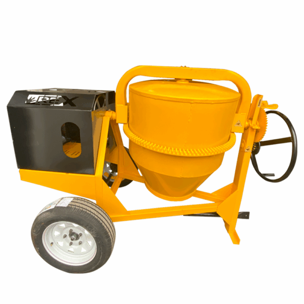 Revolvedora industrial REX con capacidad para 2 sacos de mezcla. Resistente y fácil de transportar, ideal para jornadas intensivas de trabajo en obra.