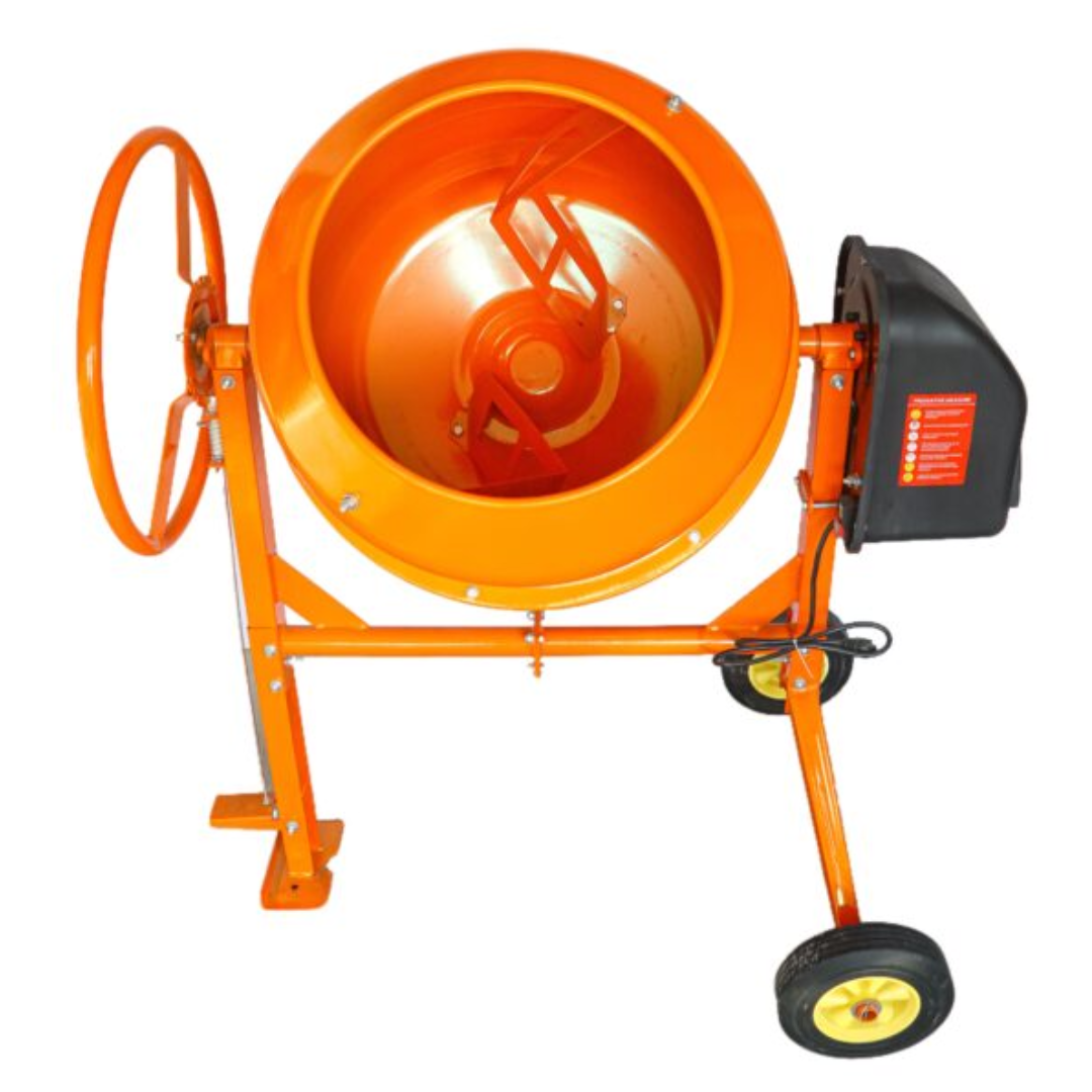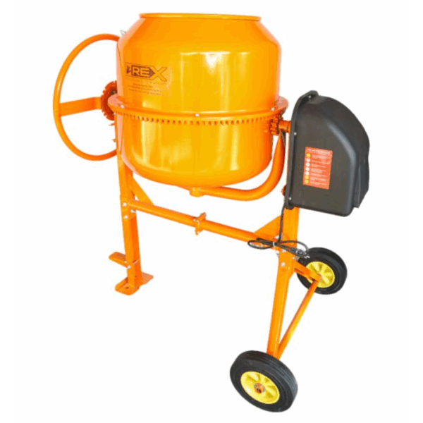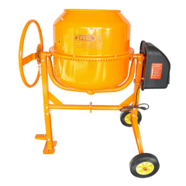 Mezcladora de concreto REX de 200 litros (1/2 saco) con motor eléctrico de 1/2 HP. Incluye ruedas y manubrio para transporte fácil en obra. Bajo consumo, silenciosa y fácil de limpiar.